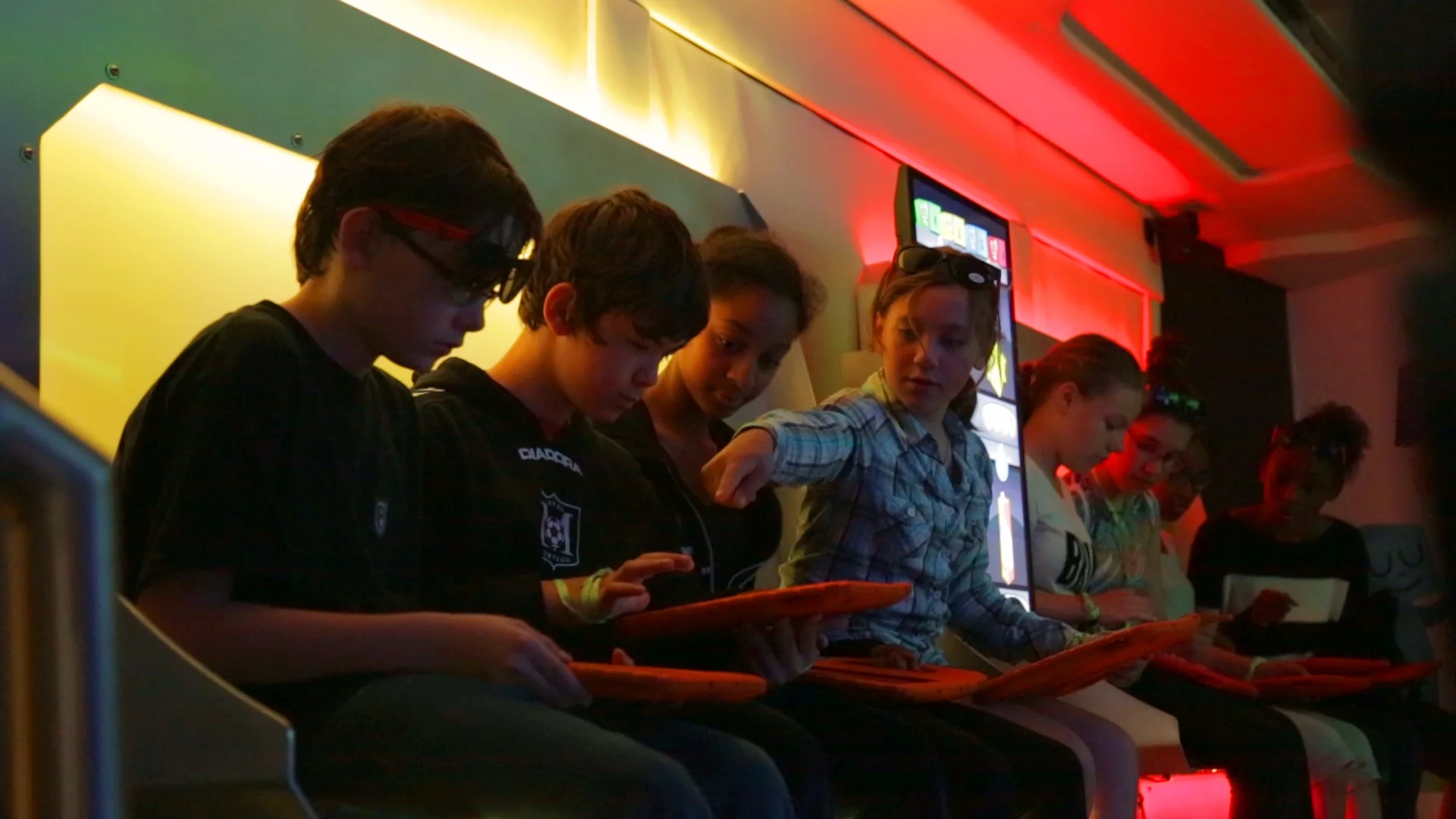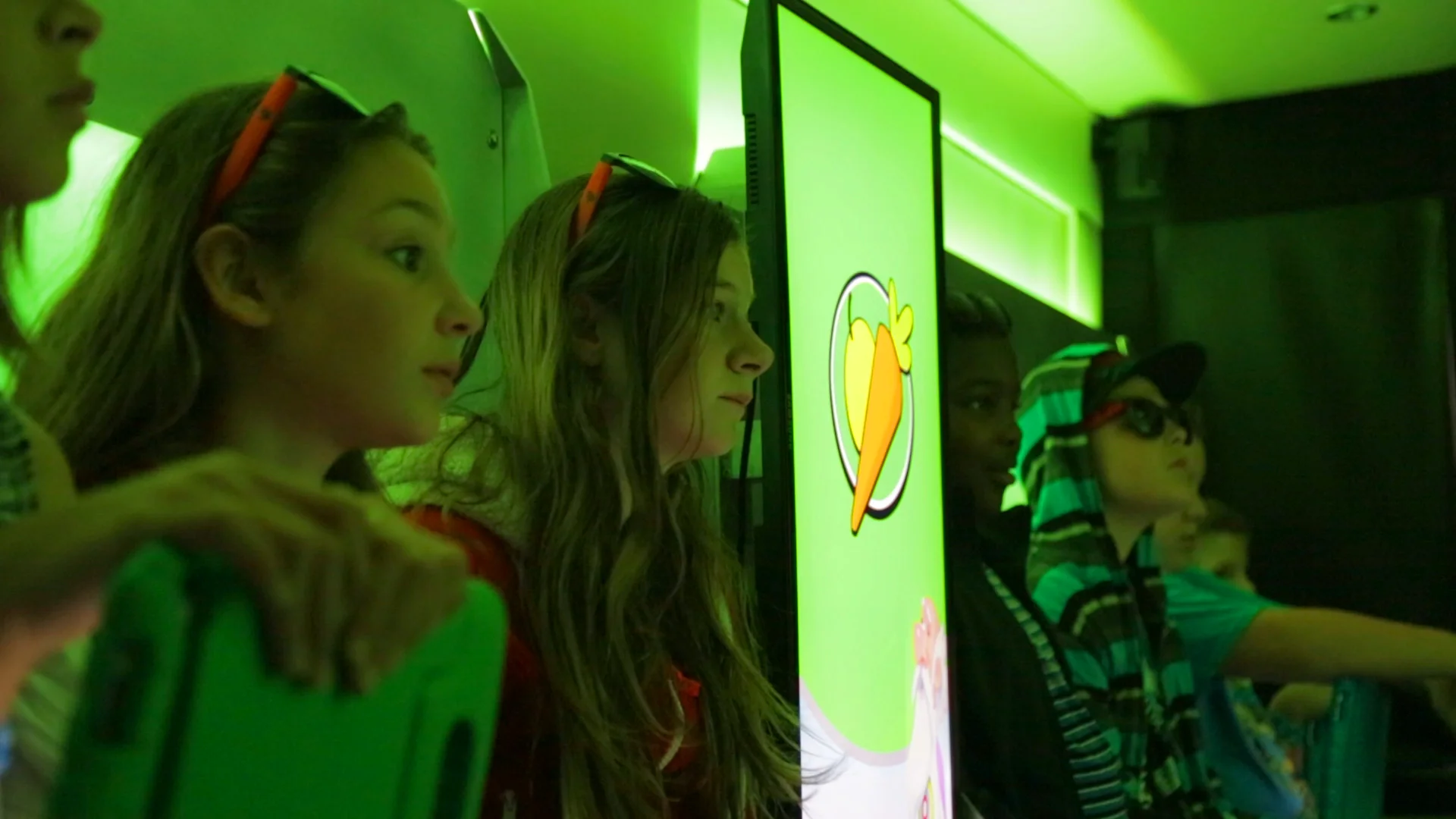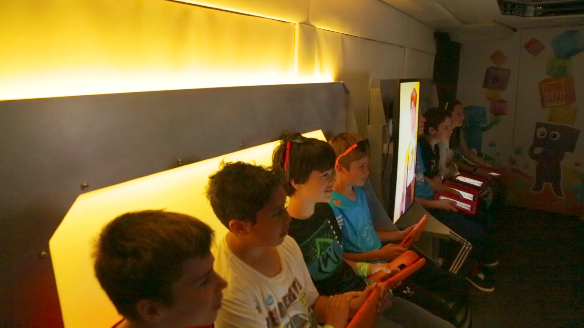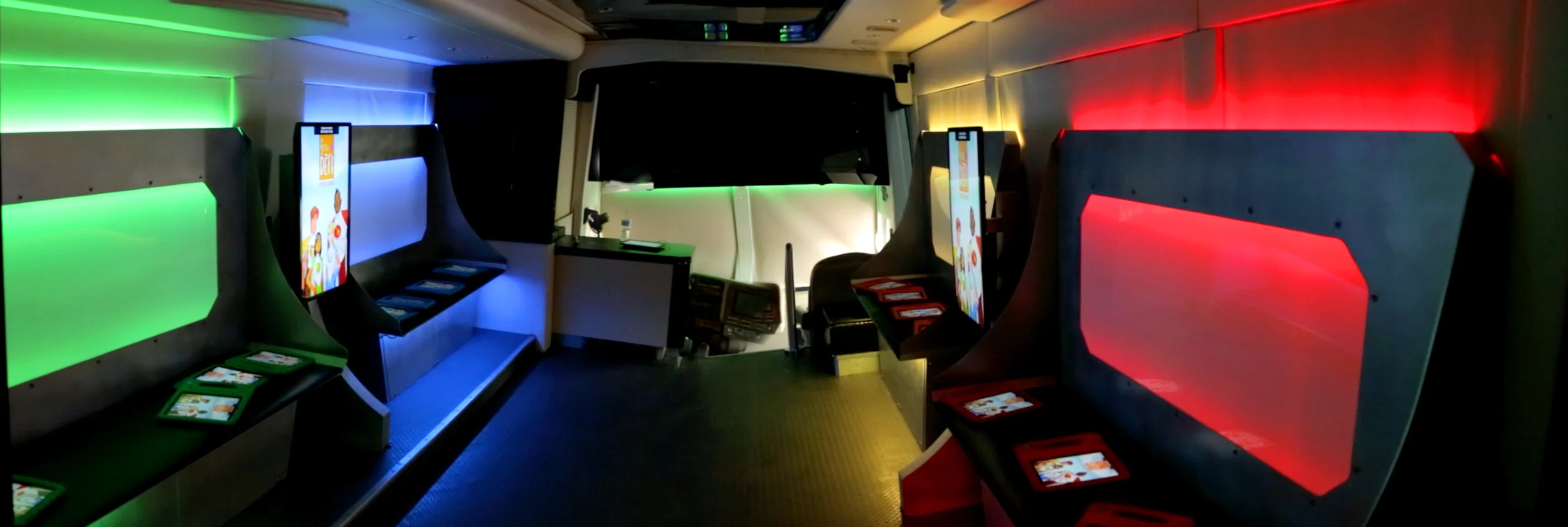 Organized by Le Grand Défi Pierre Lavoie, the Vehicube is touring primary schools across Québec and Canada, bringing an exceptional interactive experience to students. Teaching the basics of healthy eating at the " Eat Better " workshop; a collaborative video game where 4 heros personify Canada's Food Guide groups.